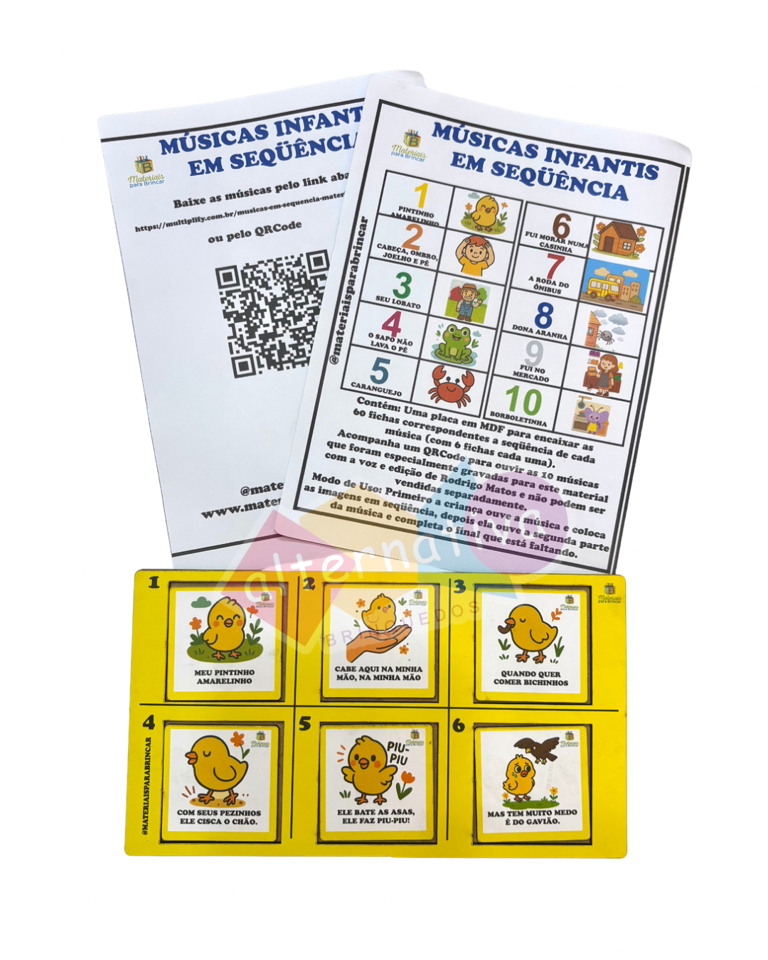 O kit conta com uma placa em MDF de alta qualidade e 60 fichas ilustradas. O grande diferencial? Um QR Code exclusivo que dá acesso a 10 músicas gravadas especialmente para este material. A criança ouve a melodia, identifica a narrativa e precisa organizar as imagens na sequência correta. É a ferramenta perfeita para trabalhar a escuta ativa e a lógica de forma divertida!
