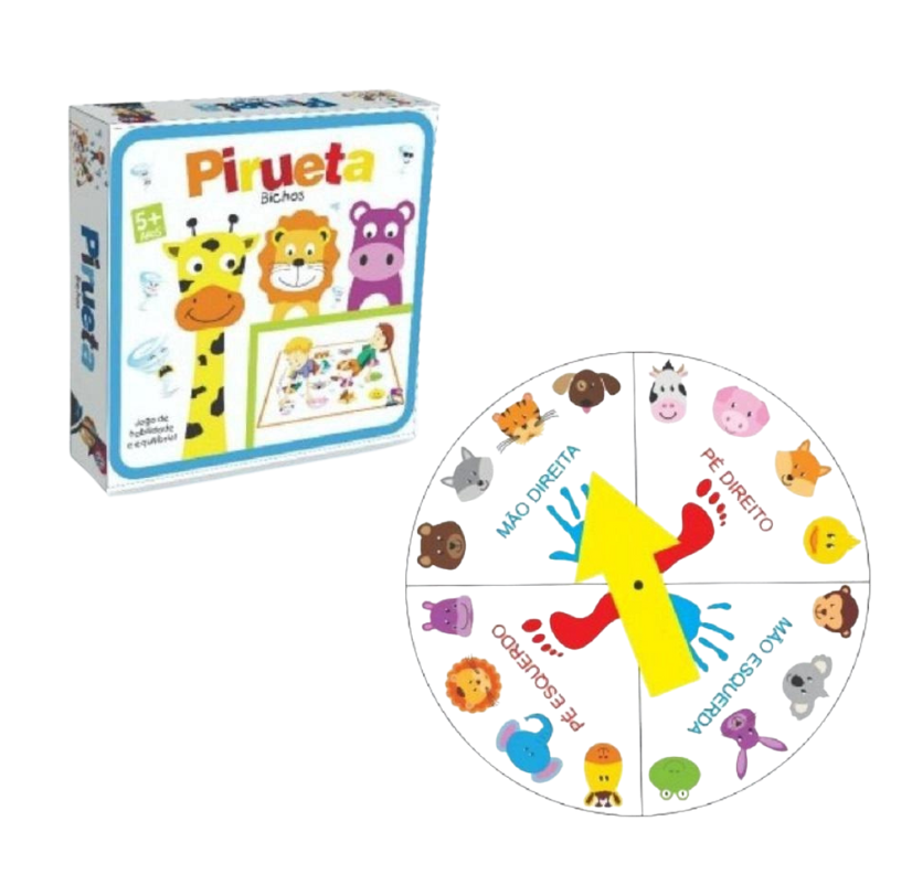 O Pirueta dos Bichos - Bate Bumbo é um convite para a diversão e o desenvolvimento das habilidades motoras e cognitivas das crianças. Girando a roleta, os participantes enfrentam o desafio de colocar mãos e pés nas figuras indicadas, sem perder o equilíbrio. Uma atividade empolgante que promove o aprendizado através da brincadeira!