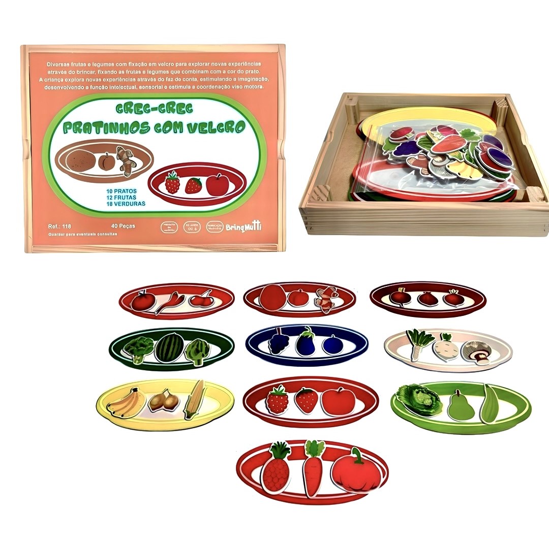 Este conjunto Crec Crec Pratinhos com Velcro - BrinqMutti apresenta uma variedade de frutas e legumes com fixação em velcro. As crianças podem explorar novas experiências através do faz de conta, combinando as frutas e legumes que se encaixam na cor do prato. Isso promove o aprendizado sobre o pareamento de cores, estimulando a coordenação motora fina enquanto manuseiam e fixam as peças.