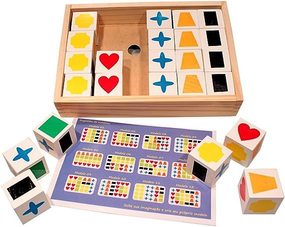 - Itens inclusos: 24 peças em madeira pintadas de branco com impressões de formas em 6 cores e modelos, acondicionadas em uma caixa de madeira + manual explicativo.